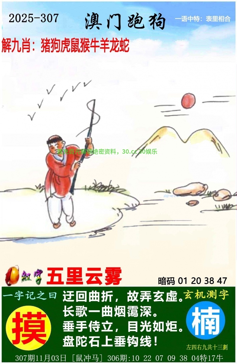 | 307期:九肖 | 猴鸡龙蛇狗猪鼠牛虎 | 开:狗20 |